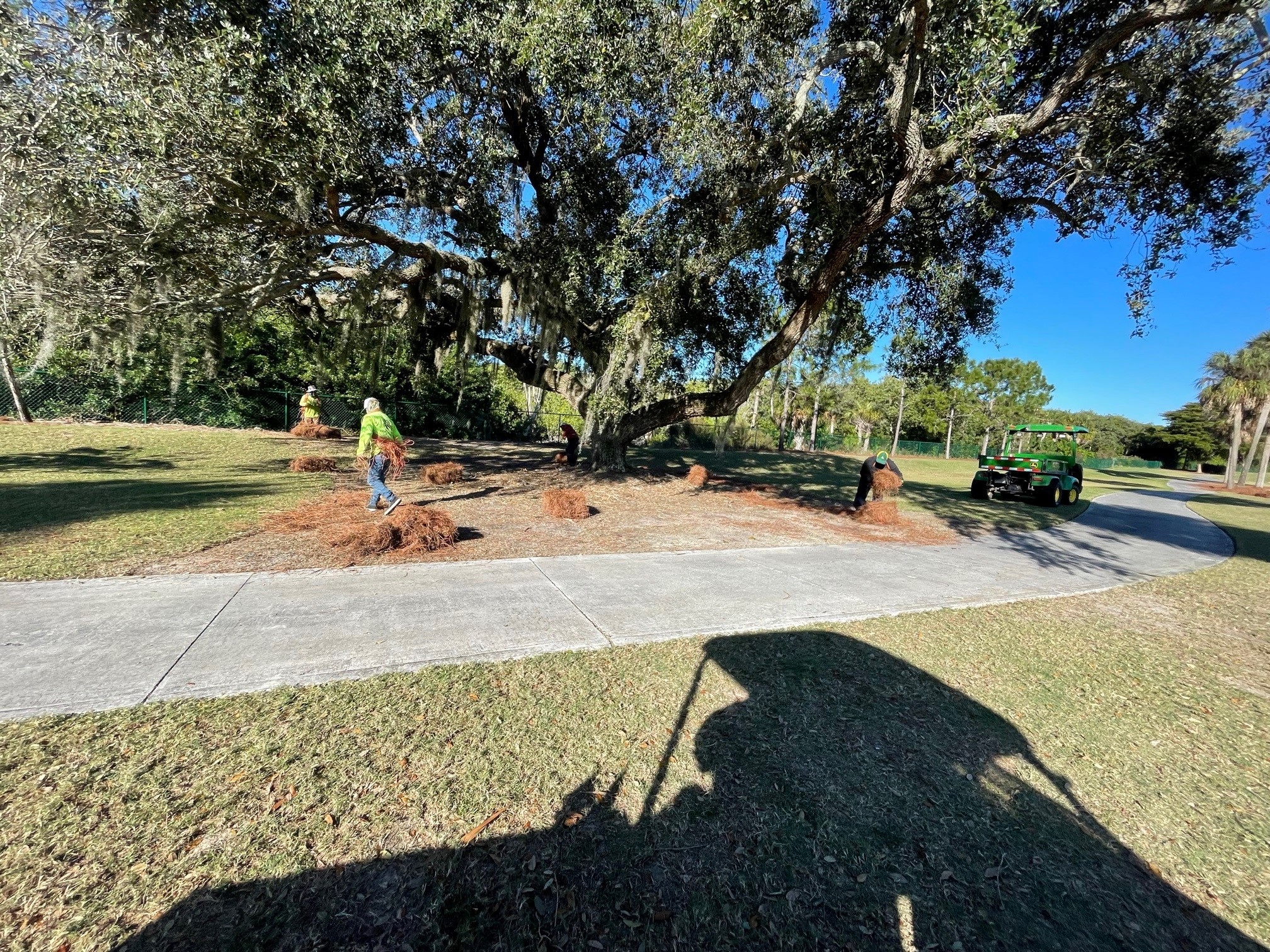 Today we have pine straw being spread on both golf courses. The straw serves two purposes. It acts as a weed barrier and has an outstanding presentation on the courses.